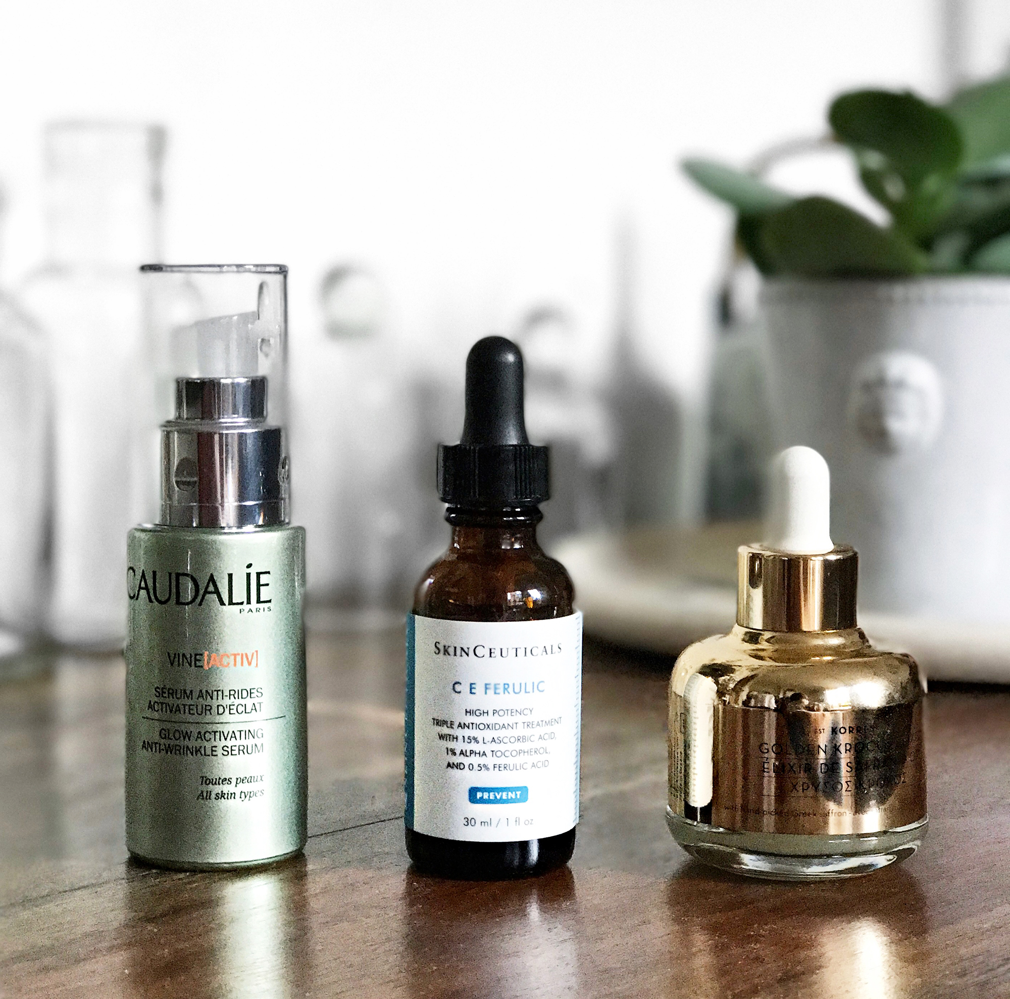 Et pourquoi je vous ai mis uniquement des sérums sur la photo, alors que d’autres produits contiennent aussi des antioxydants (des crèmes visage, par exemple) ? Parce qu’un sérum est beaucoup plus concentré qu’une crème, et pénètre plus dans la peau. Il est donc plus efficace pour cibler des besoin précis (là où la crème sert plus de protection et de bouclier final).