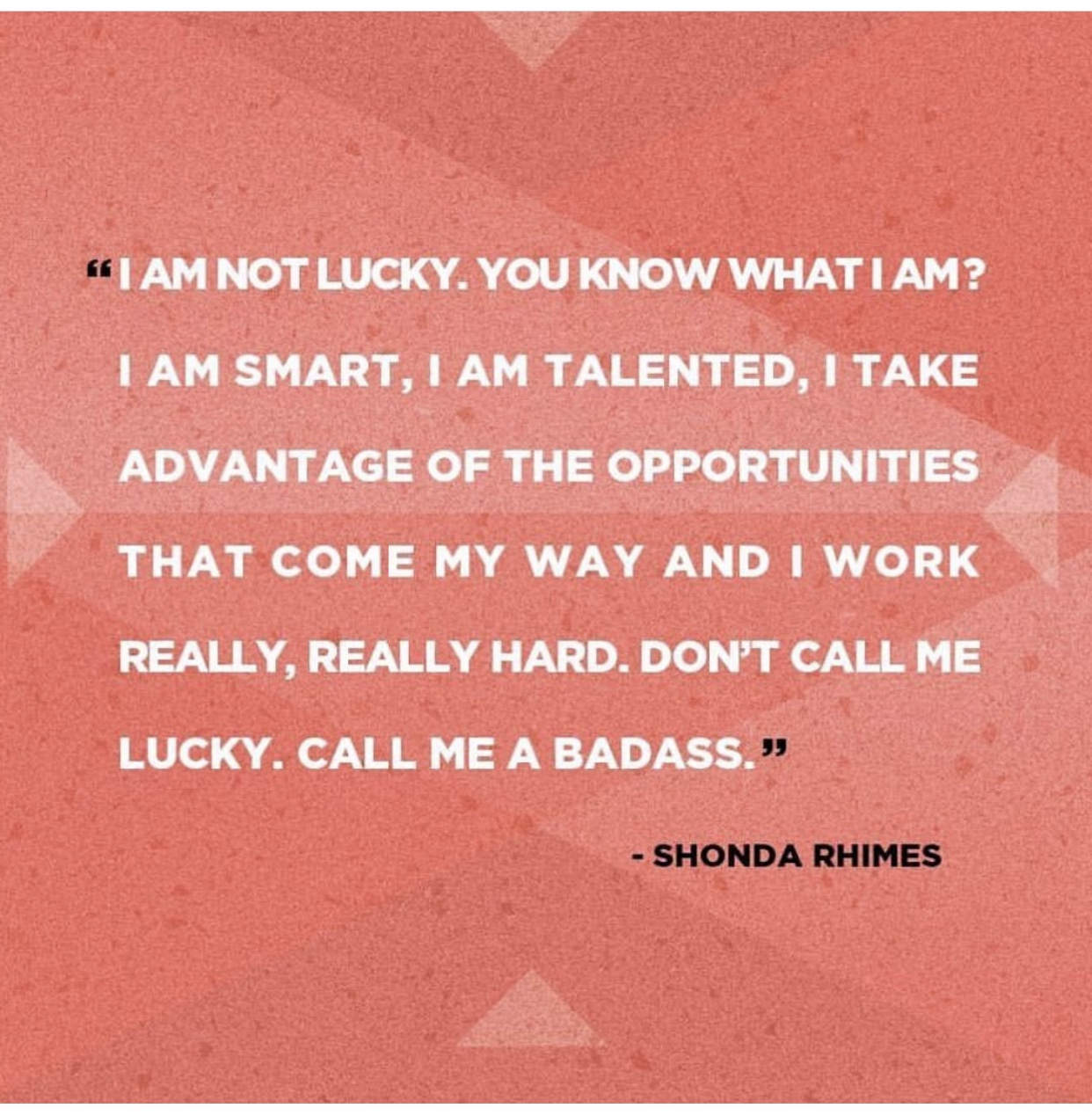 « Je ne suis pas chanceuse. Vous savez ce que je suis ? Je suis intelligente, j’ai du talent, je sais reconnaître et saisir les opportunités qui croisent mon chemin, et je travaille beaucoup, beaucoup. Ne m’appelez pas chanceuse, appelez-moi balèze / impressionnante [badass est assez difficile à traduire dans ce contexte] ».