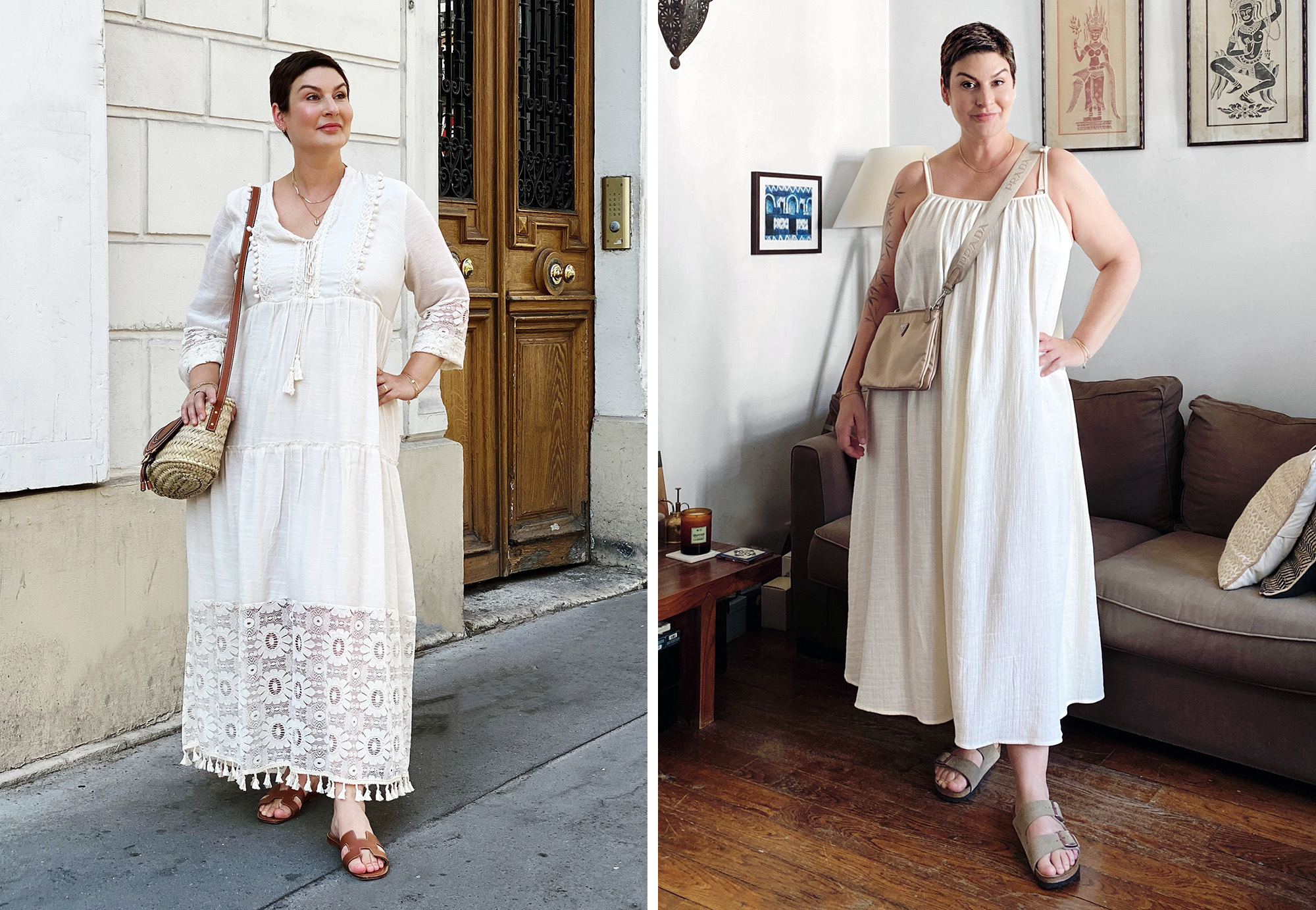 La robe de gauche vous va super bien, et ces sandales sont magnifiques!