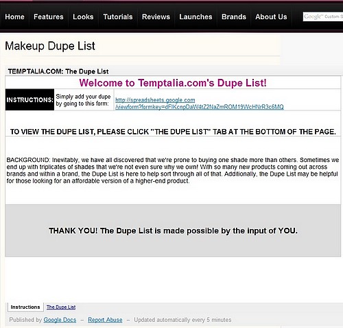 Et pour voir le tableau lui-même, il suffit de cliquer sur « the dupe list » qui se trouve en bas de la page, juste à côté de « instructions », sous le gros cadre gris qui dit « THANK YOU! The Dupe List is made possible by the input of YOU ».