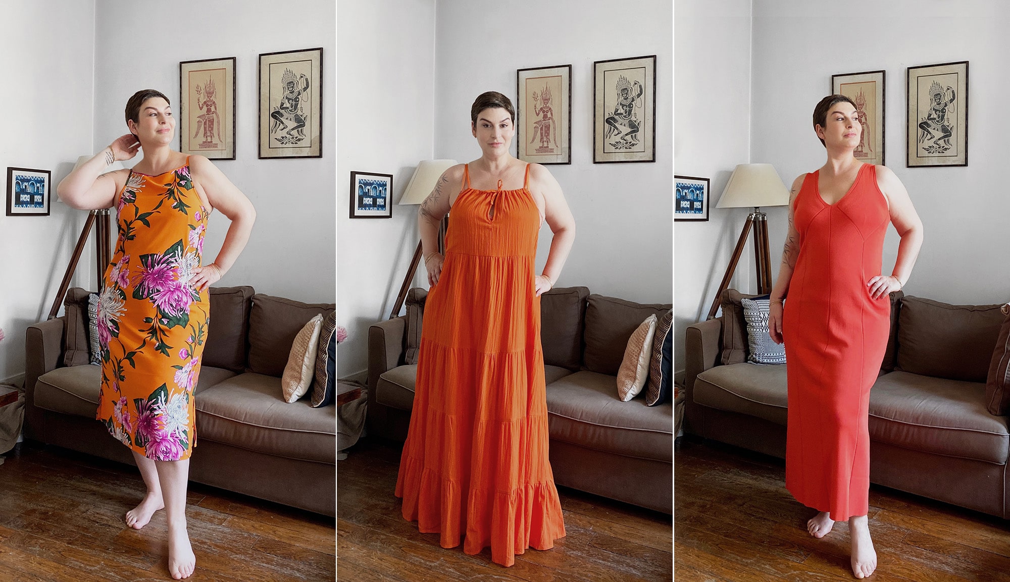 Je vais faire un commentaire qui ne va absolument pas faire avancer le schmilblick, mais je te trouve superbe dans cette couleur, et dans ces trois robes, somme toute bien différentes. Je ne suis pas très objective, Orange is my new black, j’adore cette couleur que je porte hiver comme été. J’aime les couleurs. Et malgré mes cheveux gris (pouah, faut pas mettre de jaune, faut pas mettre de orange, et gna gna gna…), je porte TOUTES les couleurs, et j’a-dore!