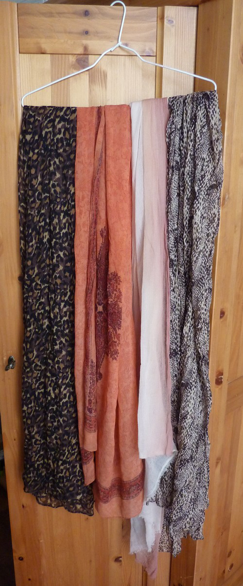 j’avais acheté il y a bien longtemps un cintre spécial, composé d’une base en bois et d’anneaux verticaux, cinq de chaque coté, dans lesquels glisser les foulards, mais finalement, je trouve que le cintre, c’est une bonne méthode…