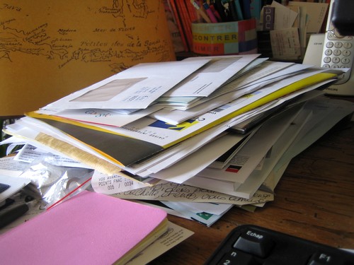 Vous voyez ce tas de papiers ? C’est l’état de mon bureau au naturel (même la femme de ménage a renoncé à y toucher, allez savoir, il y a peut-être des bêtes au fond). C’est juste à gauche de mon PC, donc j’ai ce tas atroce sous les yeux toute la journée, qui me crie sournoisement : « tu n’as pas trié ta paperasse depuis 1842, tu es vraiment trop nulle ! ».