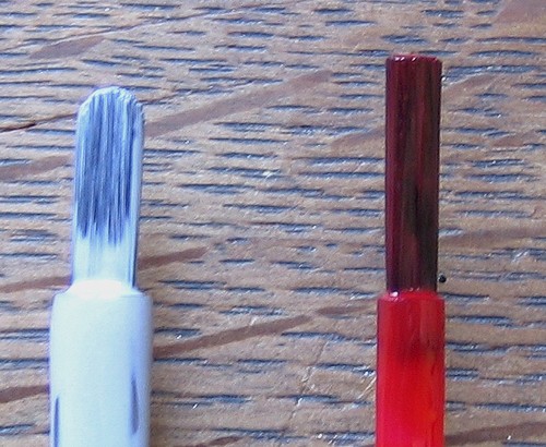 Là sur la photo je vous ai mis un pinceau OPI (à droite, rouge) et un pinceau Sephora (à gauche, gris).