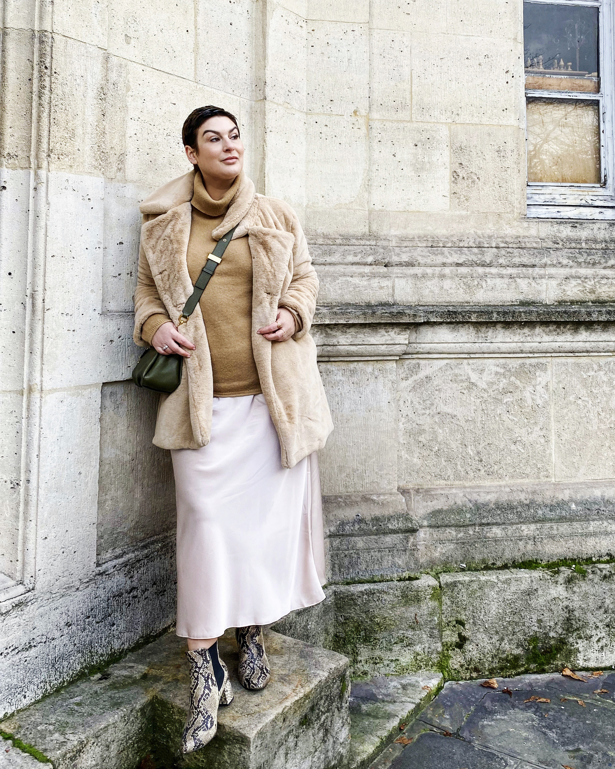 Coucou Hélène , très bon choix , le tissus chatoie et cela s’oppose aux matières du pull et de la veste , avec un peu de reptile top et cela te va bien , tu es dans ton style.