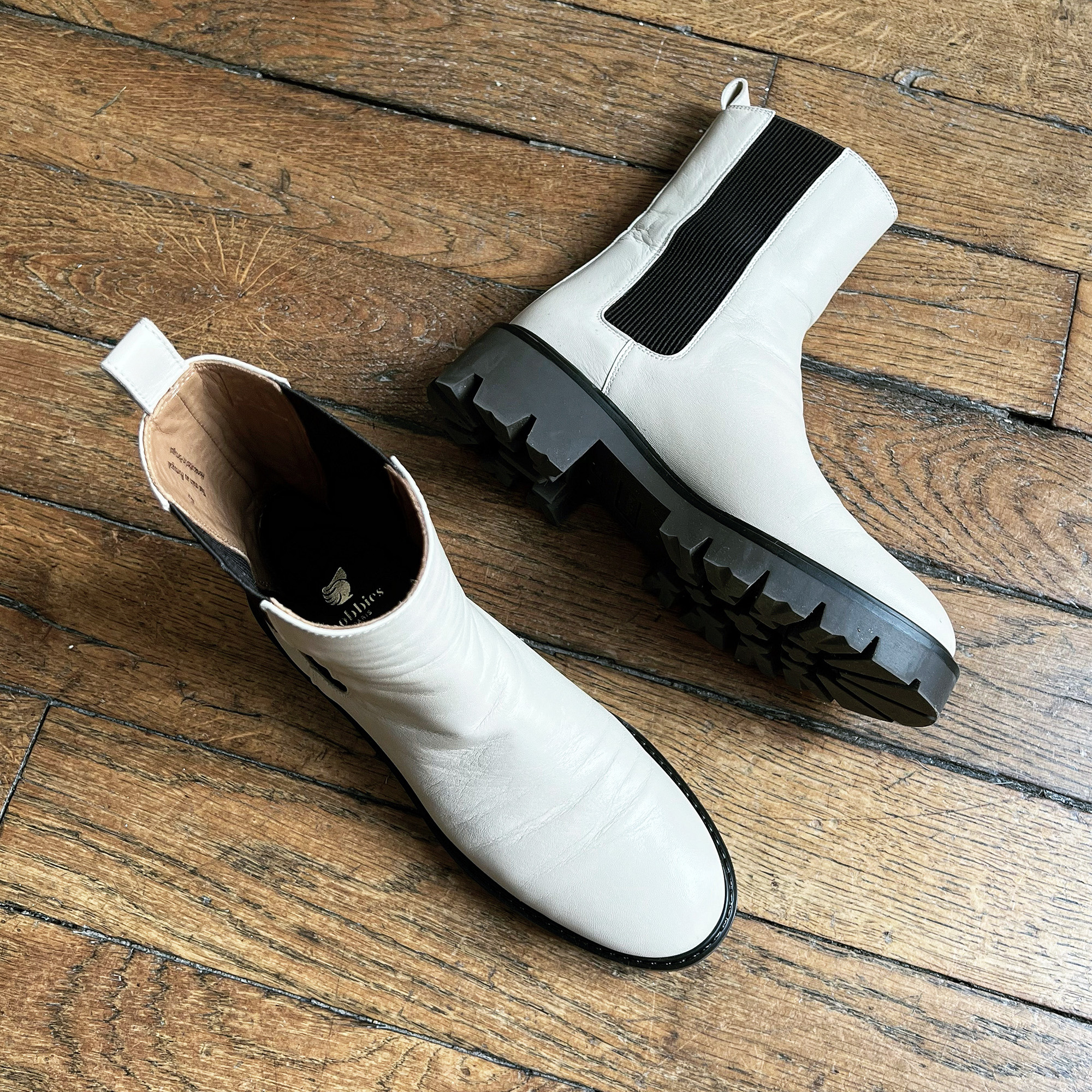 J’adore la série sur le mouton enchanté et cette fois-ci en plus je m’identifie: j’ai acheté l’hiver dernier des combat boots en néoprène noir qui en fait ont la forme de grosses chelsea boots. Elles viennent de chez Pretty Ballerinas (ils ne font pas que des ballerines). C’est drôle comment notre regard change, juste quelques mois avant je n’aurait pas pensé que j’allais porter ça. J’aime beaucoup tes deux paires, surtout les claires.