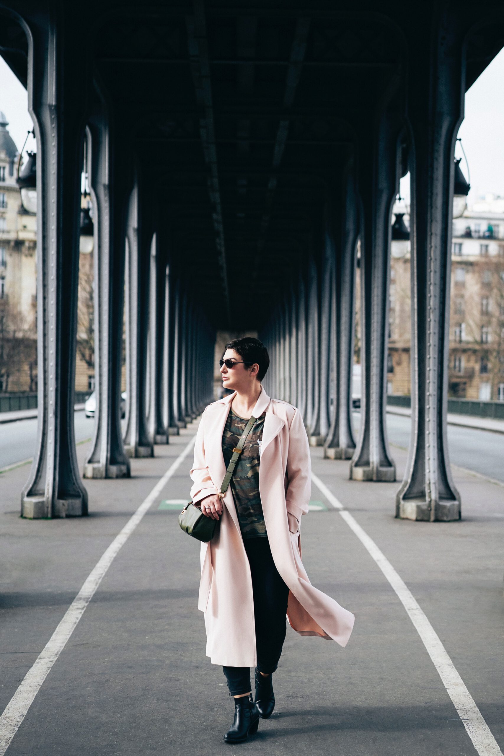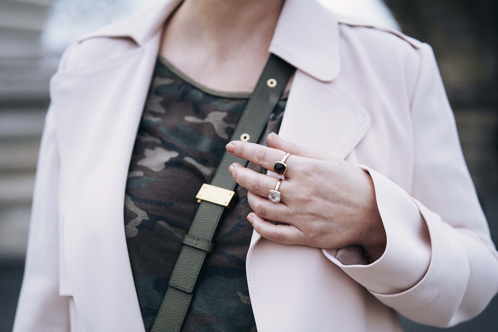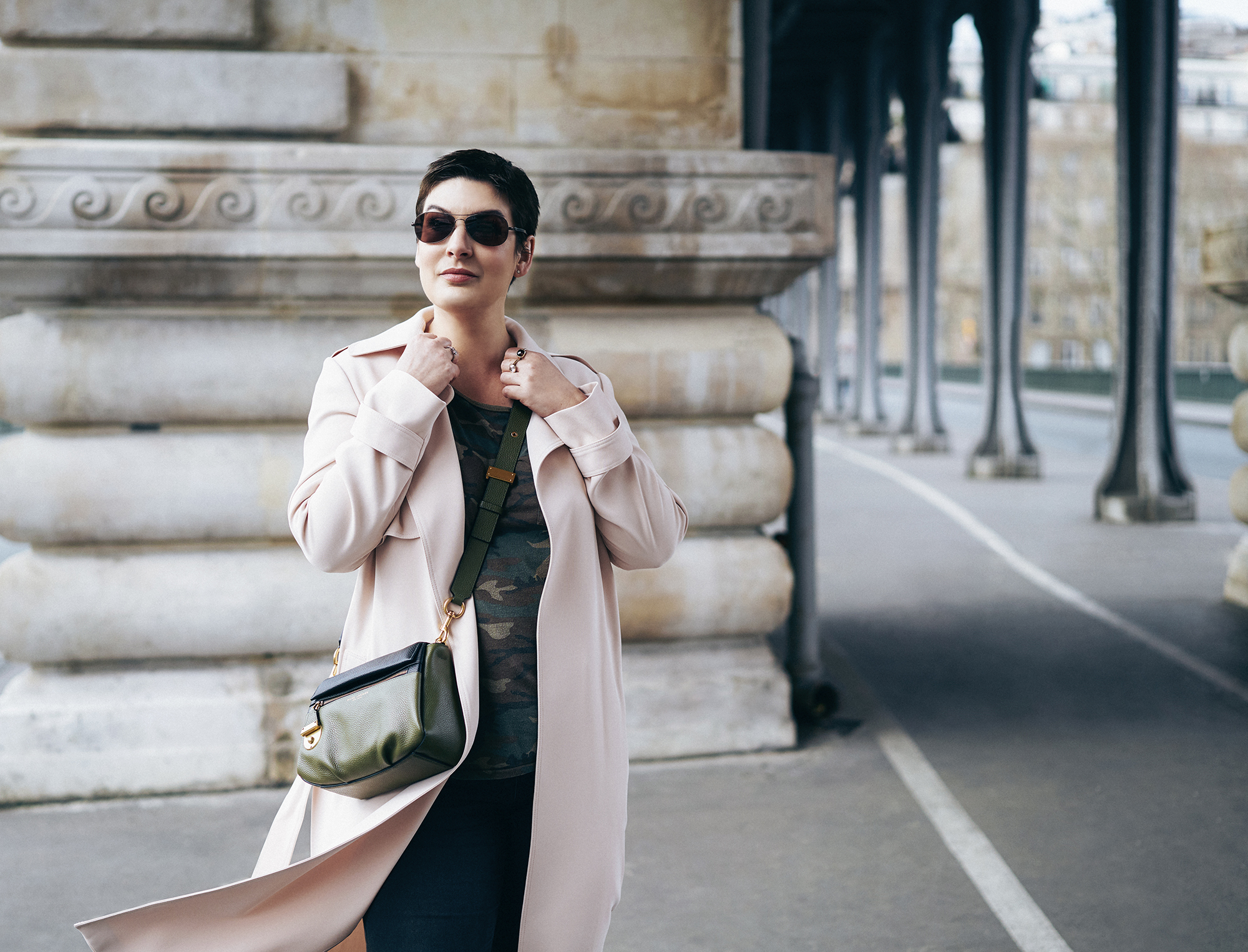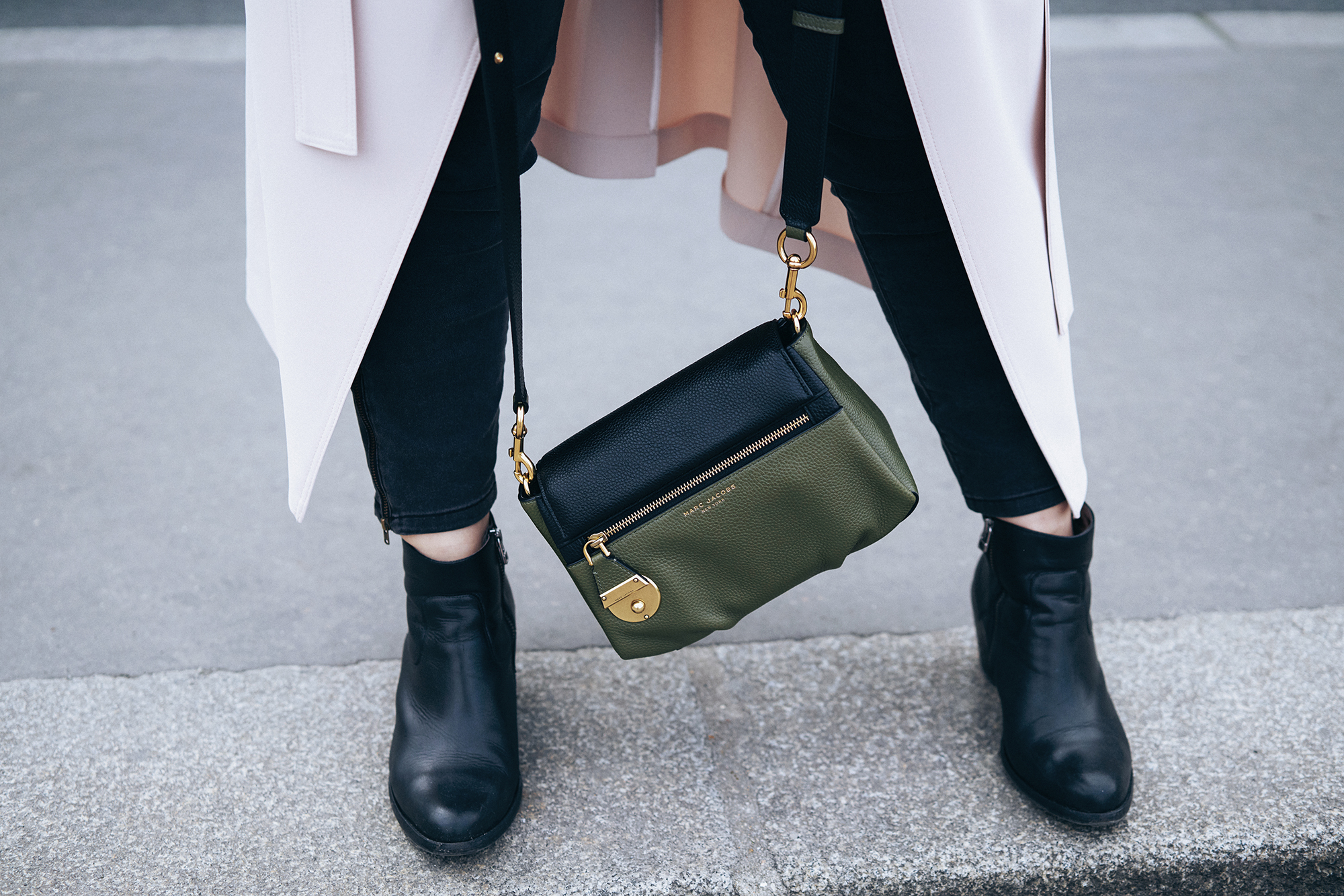 Le rose poudré et presque velouté du trench + le kaki grenu du sac => miam !