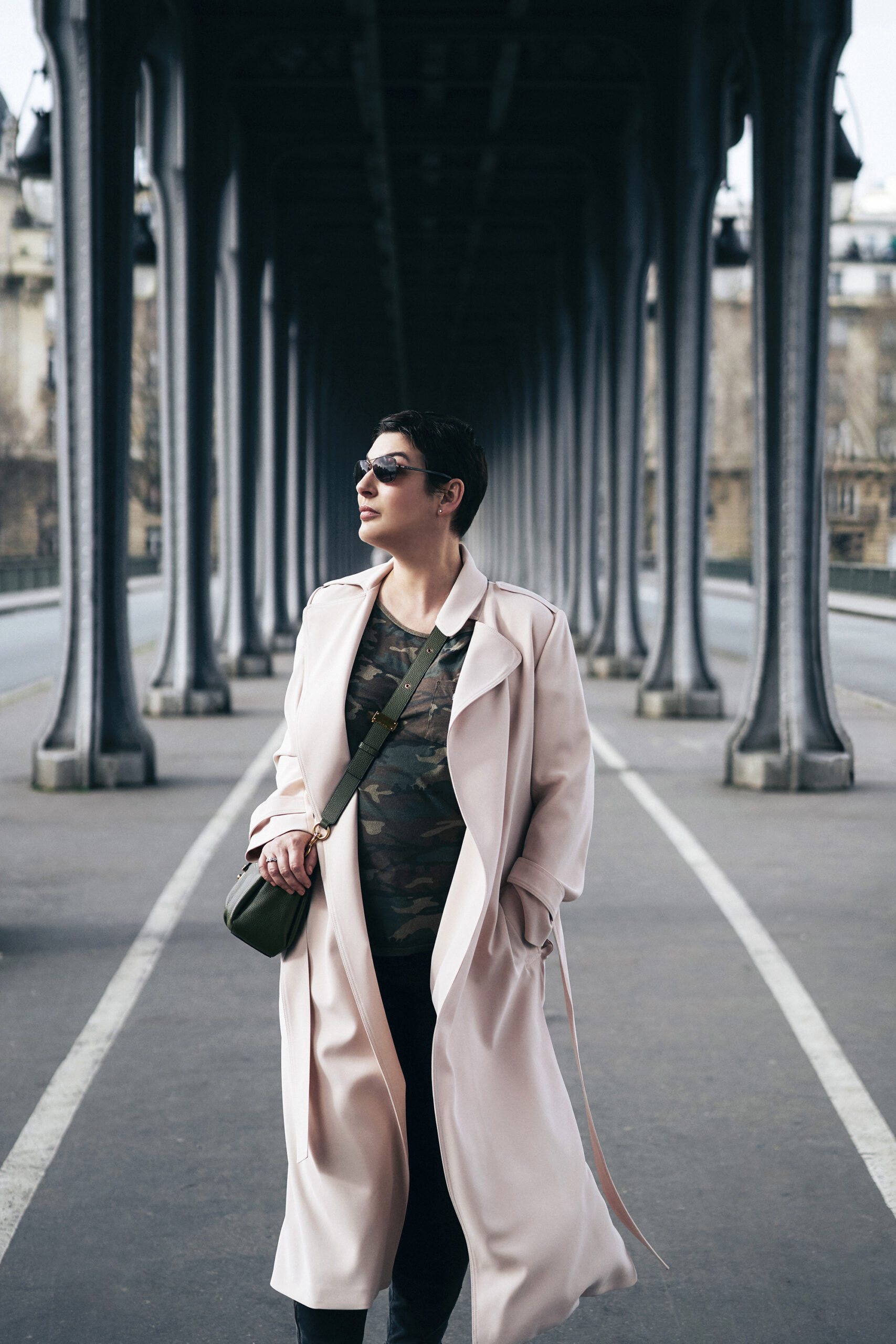 La couleur poudrée du trench se marie à merveille avec le kaki de ton t-shirt. Fan de ce look !