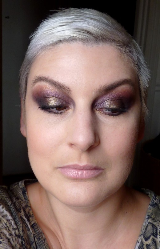 Moi non plus je ne suis pas fan de violet sur les yeux (teint pâle/jaune, yeux marrons clairs et cheveux noirs), mais j’adore cette association prune / or, ça te va très bien !