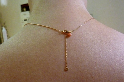 … et de dos (porté ici raccourci) avec notre petite signature : une perle de corail près du fermoir (on adore le corail toutes les deux ;-)