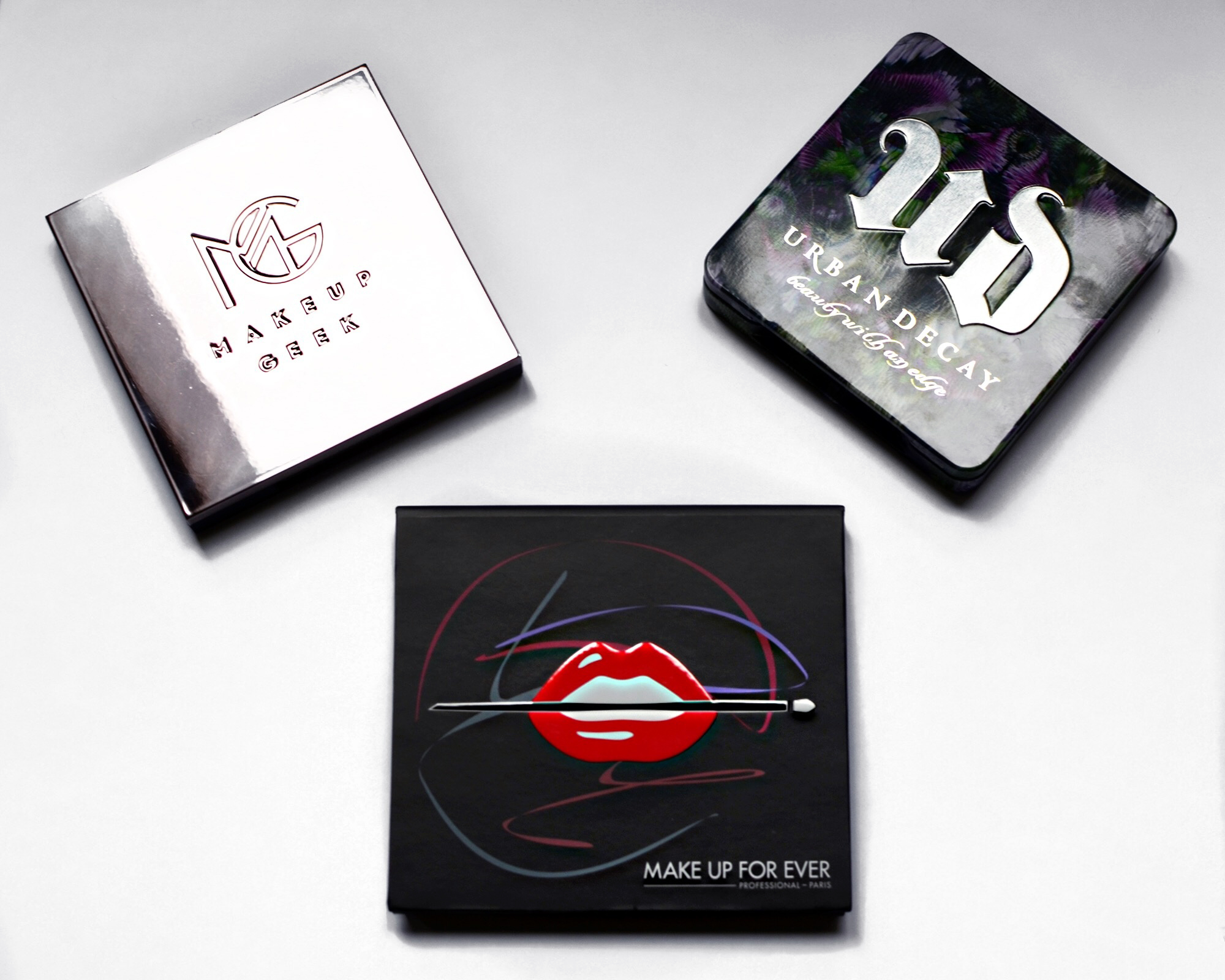 La Urban Decay est une palette vide dans laquelle j’ai mis mes 4 fards préférés de la marque (ça n’a pas été facile de choisir ;- ) : Sin, Suspect, Snakebite et Blackout. Mêmes qualités que les Mufe, les chutes en plus. Même taille de miroir, aussi (8cm x 8 cm). Elle est en métal.