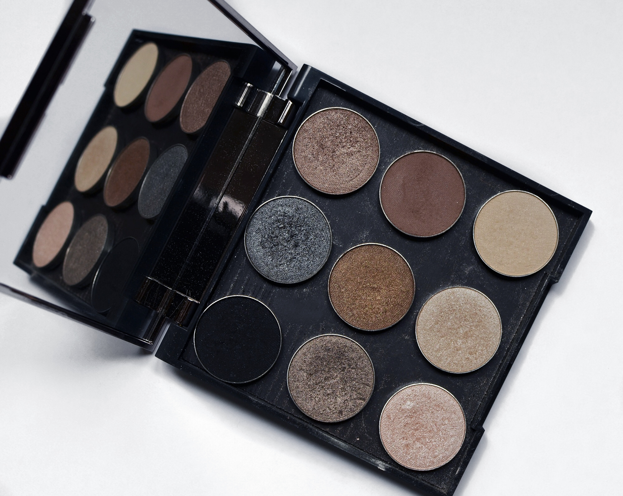 – elle doit contenir les teintes qui me vont le mieux et que je suis sûre d’utiliser, soit un champagne irisé, un brun clair froid irisé, un brun foncé (pas trop chaud) irisé, et un noir mat. Avec ça je peux tout faire, ce sont les couleurs qui me vont le mieux et que j’aime le plus.