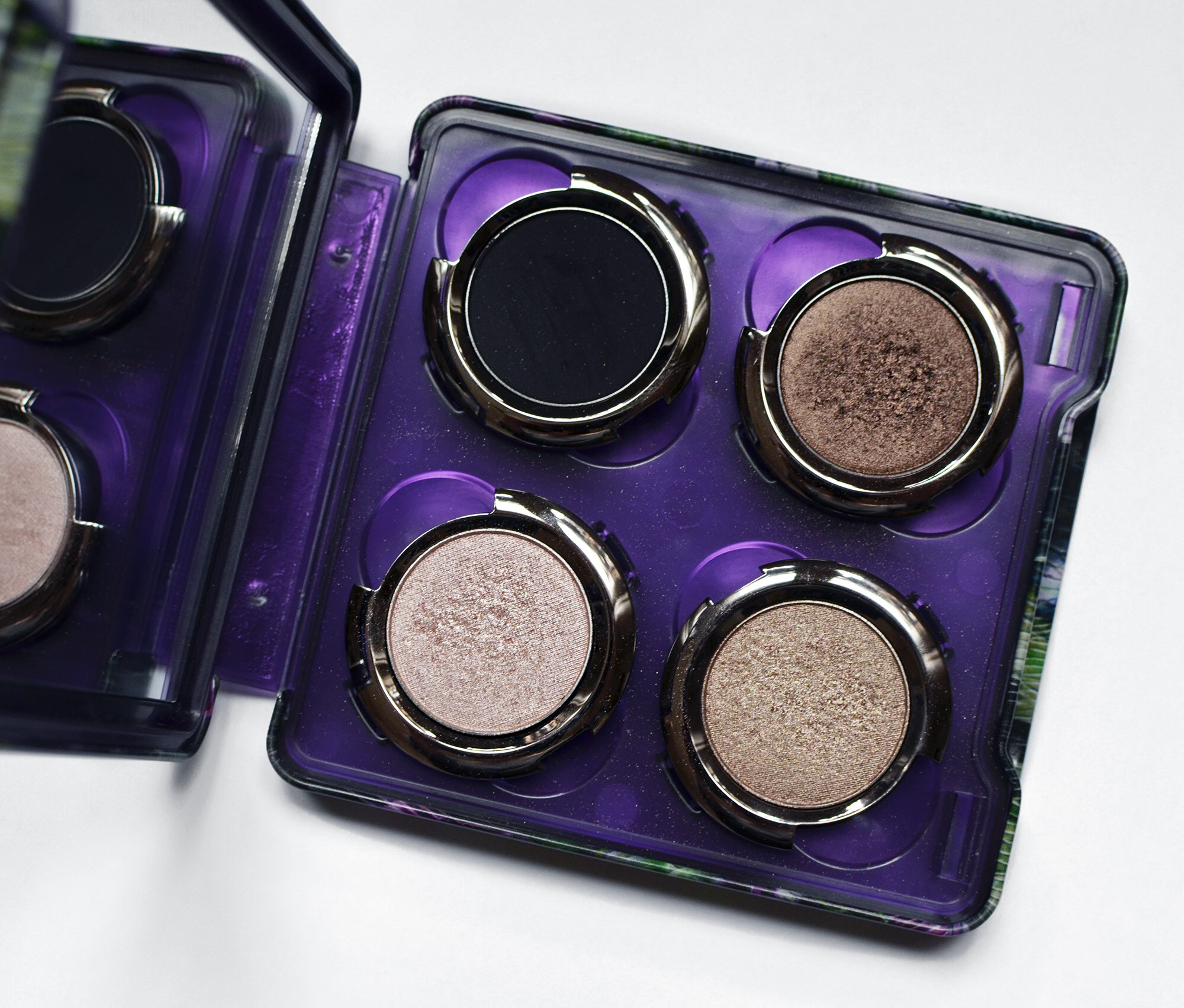 Les fards sont de très grande qualité (je dis toujours que c’est le meilleur rapport qualité-prix du marché), très jolies couleurs, excellente pigmentation et tenue, quasi pas de chutes. J’y ai mis les fards Corrupt, Graphite, Homecoming, Moondust, Pretentious, Barcelona Beach, Shimma Shimma, Bling et Vanilla Bean.