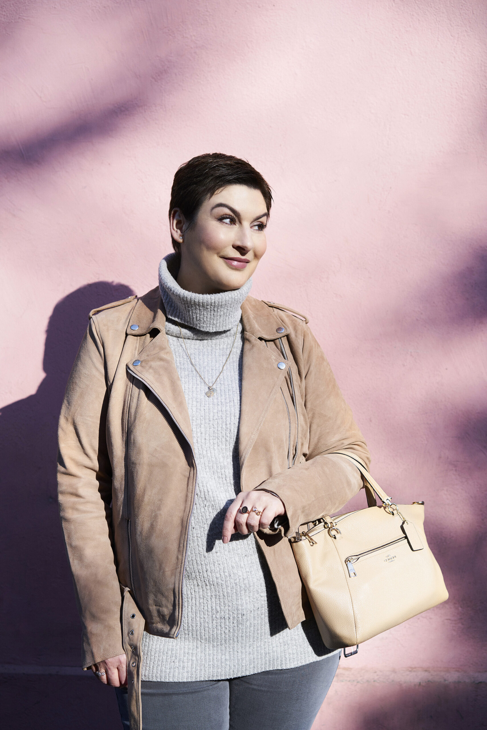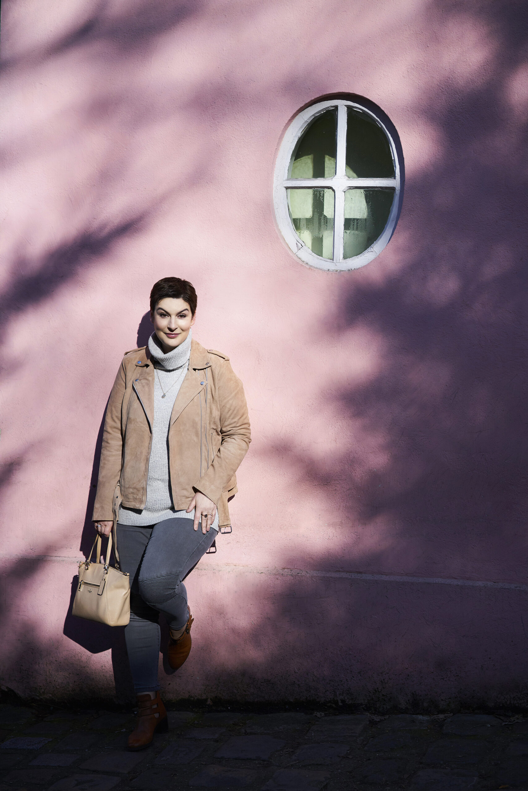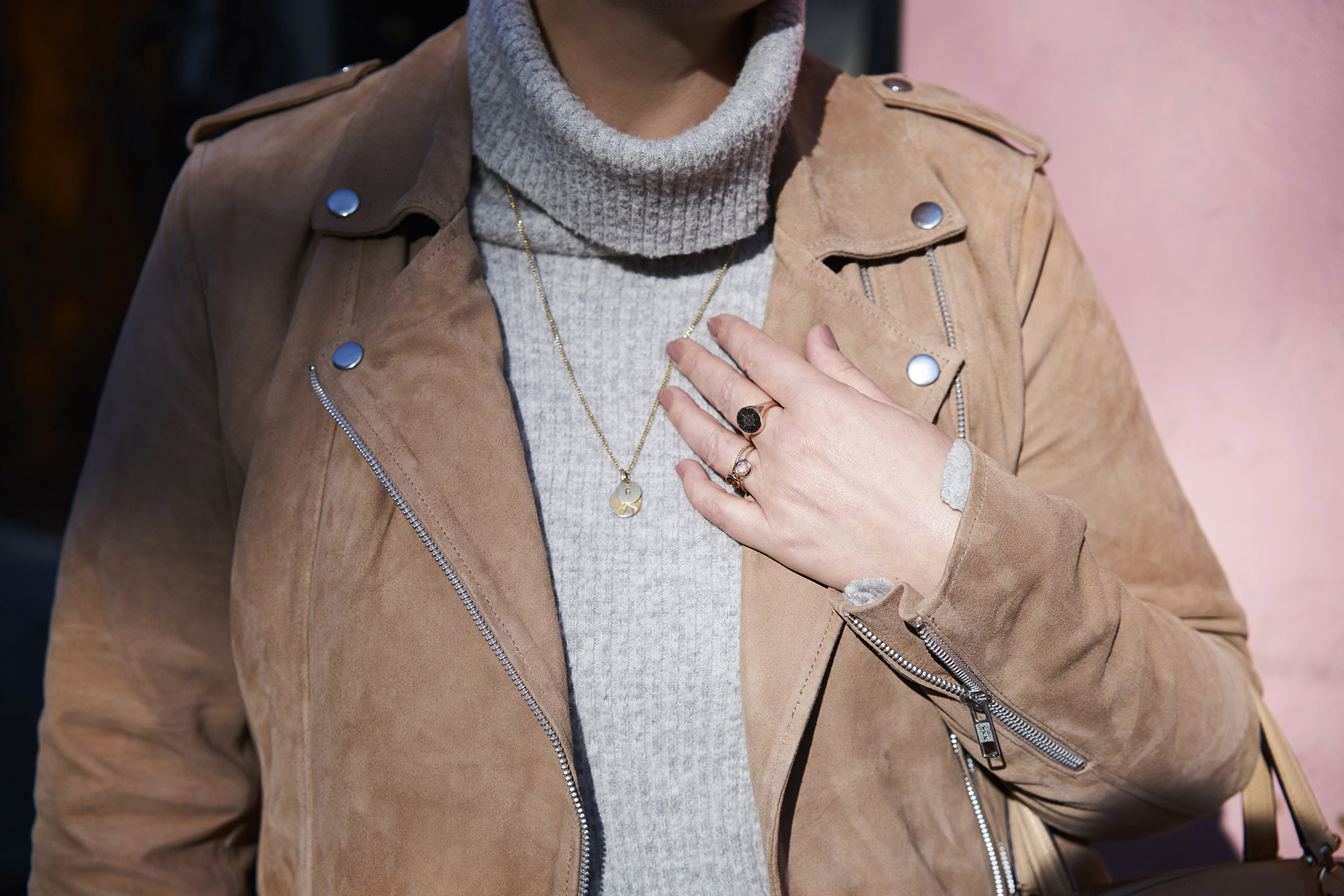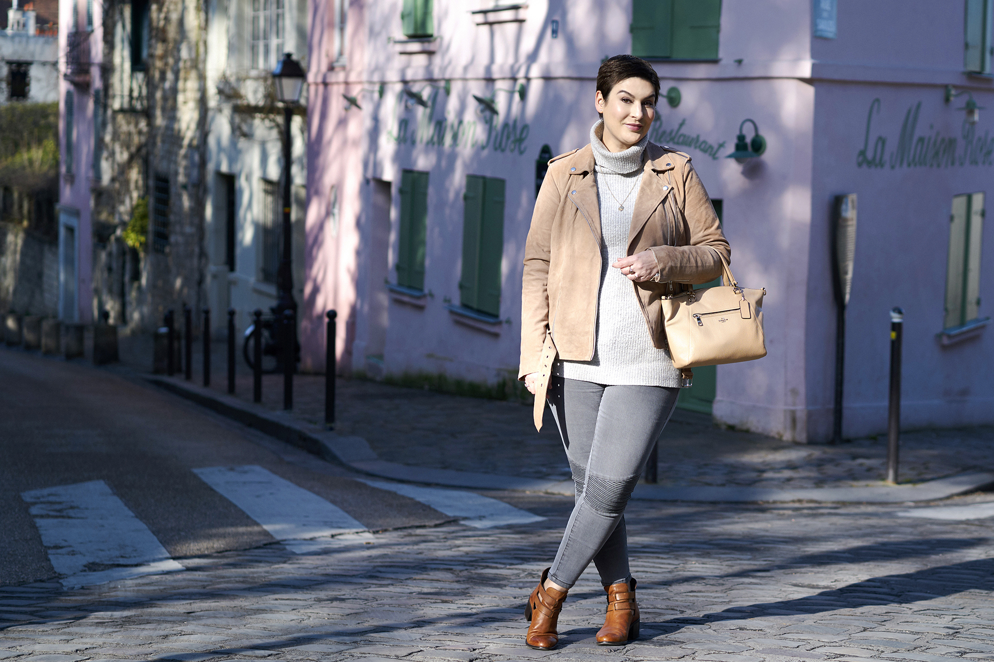 Vous savez combien j’adore les teintes nudes, qui ressemblent finalement à des tonalités qu’on rencontre en maquillage (poudre, blush…). Je n’ai pas pu résister à ce perfecto, une couleur pareille ne se voit pas souvent. Avec du gris clair lumineux je trouve ça magnifique, ce n’est pas la première fois que je porte un genre de camel avec du gris, j’aime beaucoup ces couleurs ensemble (en maquillage aussi, d’ailleurs ;-).
