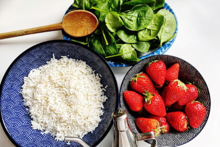 Quand c’est bien chaud, ajoutez le riz (si c’est du riz déjà cuit et conservé au frigo, rajoutez un coup de chauffe pour lui faire reprendre sa consistance normale ; s’il est tout juste cuit ou que vous l’avez réchauffé au micro ondes, c’est prêt tout de suite).