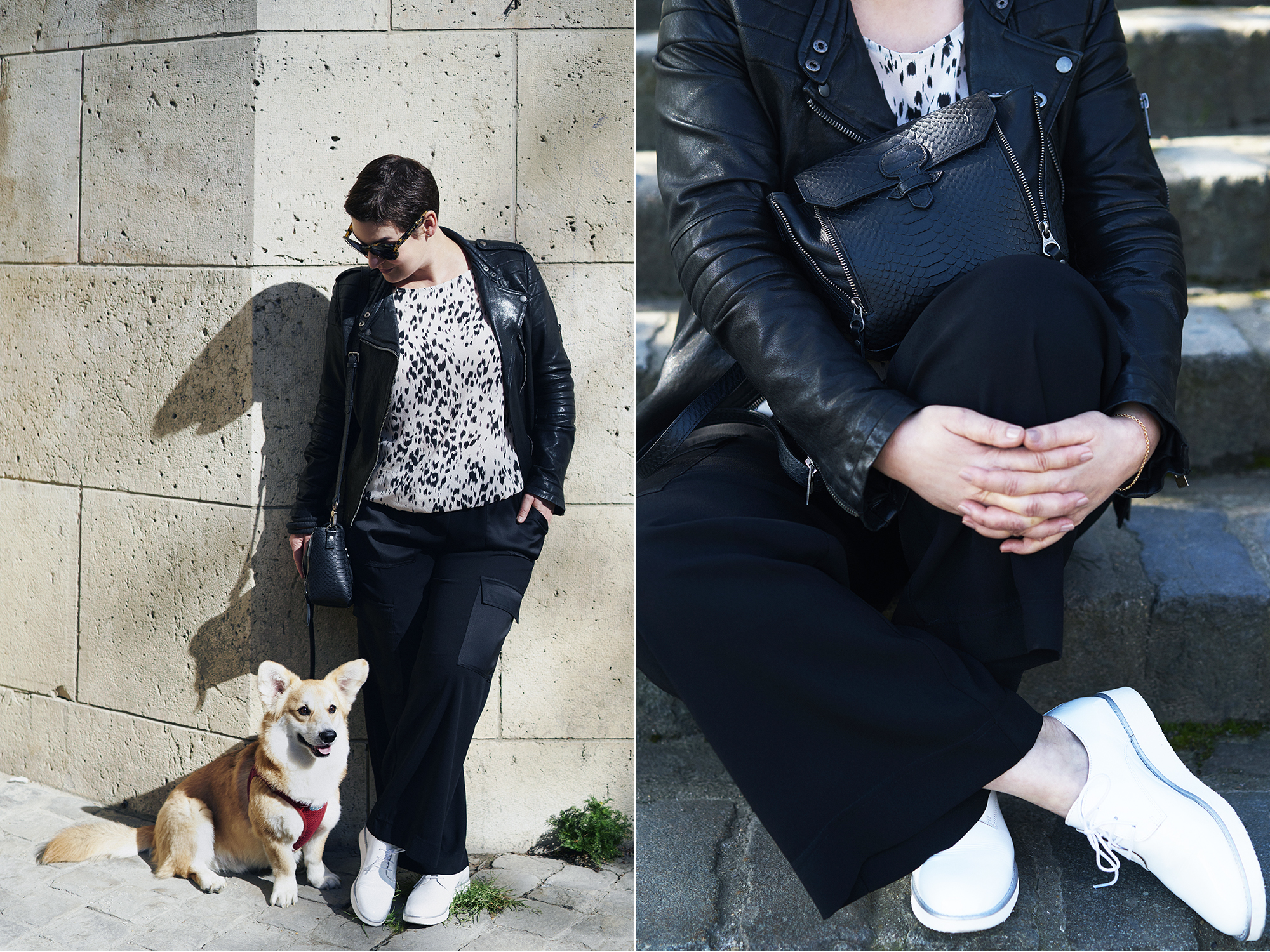 Mon pantalon vient sans surprise de chez Asos, je l’adore parce qu’il est à la fois méga confort et plus classe qu’un jean (ça nous change bien), et j’ai sauté le pas de l’imprimé animal avec cette tunique 1.2.3 que je trouve sympa associée au reste.